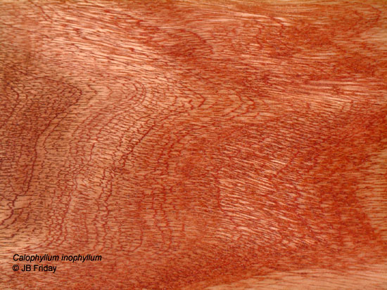 Kamani grows near the seashore, and reaches heights of 40 to 60 feet, diameters up to 36 inches. The heartwood is reddish brown, with a moderate density (specific gravity .6). It was traditionally used for bowls. The wood is lustrous and the interlocking grain shows a dramatic braided ribbon stripe on the quartersawn face. It is relatively difficult to work because of the interlocked grain, but very fine cabinetry has been made from it. The doors on the main floor of ‘Iolani Place have panels of Kamani veneer.